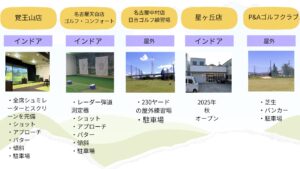 名古屋市内を中心に、屋外・インドア・実践型の4つの練習場でレッスンを展開。 月額定額で通い放題、体のタイプに合わせた“4スタンス理論”で、無理なく効率的に上達できます。